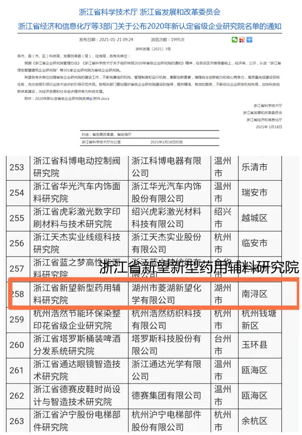 湖州市菱湖新望化學(xué)有限公司榮獲 “浙江省新望新型藥用輔料研究院”稱號